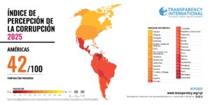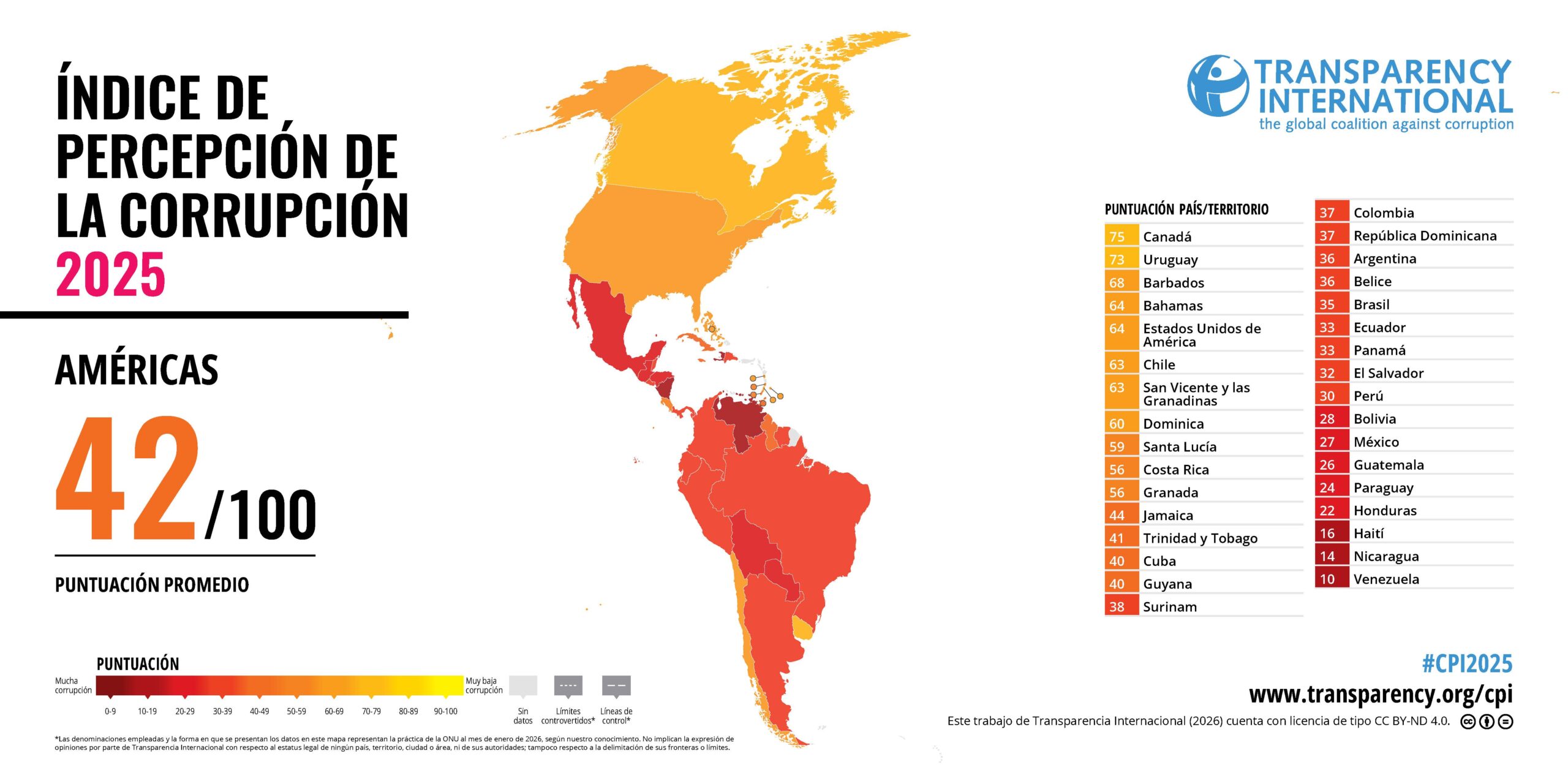 Con una puntuación promedio de apenas 42 sobre 100, las Américas no muestran avances en la lucha contra la corrupción, según el Índice de Percepción de la Corrupción (IPC) 2025 de Transparencia Internacional publicado hoy, 10 de febrero. Desde 2012, 12 de los 33 países en la región han empeorado considerablemente, mientras que solo República Dominicana (37) y Guyana (40) han registrado mejoras significativas. Años de inacción gubernamental han erosionado la democracia y permitido el crecimiento del crimen organizado transnacional, perjudicando directamente a las personas, al socavar los derechos humanos, los servicios públicos y la seguridad